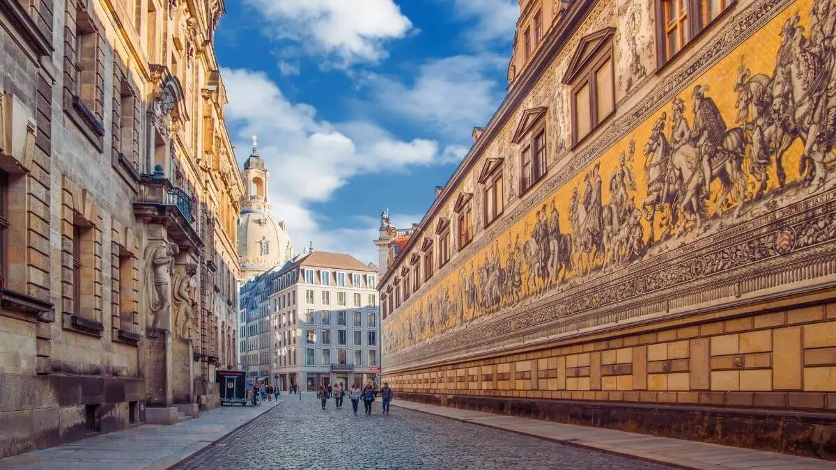 As you leave the cathedral area, follow the Fürstenzug — a 102-meter mural made of 24,000 Meissen porcelain tiles. It depicts Saxon rulers through the centuries and stands as one of the largest porcelain artworks in the world. It’s a perfect spot for photos on your way to Neumarkt Square.